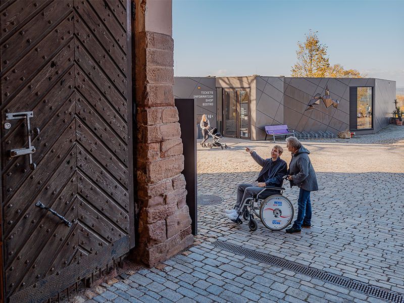 Rollstuhlnutzer dürfen mit dem PKW bis nach oben zur Burg hinauf fahren und auf dem Vorplatz aussteigen.