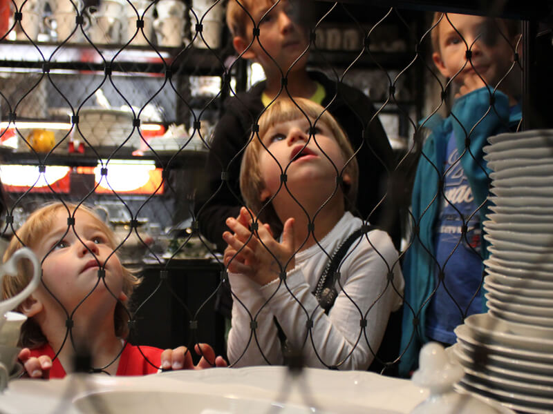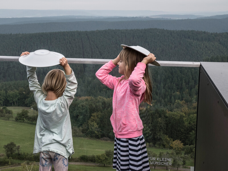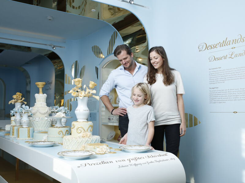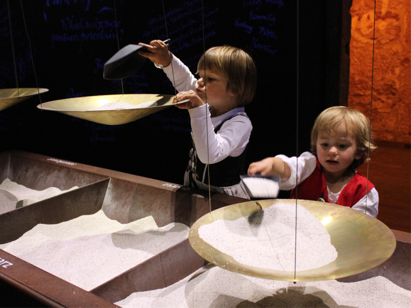 Kinder sind besonders fasziniert vom 80 Meter tiefen Burgbrunnen oder auch von den etwas gruseligen Geschichten, denen man im Marterturm an den sprechenden Steinen lauschen kann. Wie viele Stufen führen bis hoch auf den Bergfried? Kinder kriegen es heraus! In den Porzellanwelten entdecken Kinder am liebsten den Tüllensittich, die Schalenkröte oder den Henkelkrebs; schauen den Abenteuern des Bauern Deng mit seinem Drachen im Schattentheater zu und staunen vor der lebendigen Wand in der Wunderkammer. Kinder lieben es, bei uns in Waagschalen selbst die geheime Mischung des Porzellans heraus zu finden und anschließend mit aller Kraft den laut fauchenden Blasebalg zu bedienen und so eine 'Vase' im virtuellen Brennofen zu fertigen. Staunen ist auch vor der größten Vase der Welt angesagt, die mit 360 Motiven aus der Natur bis acht Meter hoch bemalt ist: 80 Kakaobecher müssten flinke Kinderhände stapeln, um diese Höhe zu erreichen – sogar eine Giraffe wäre kleiner, wenn man sie daneben stellt! Ein besonderer Höhepunkt ist der Steg der Wünsche, auf dem Kinder ihren Wunschteller, der zuvor von ihnen mit geheimnisvoll leuchtender Zauberschrift bemalt oder beschrieben wurde, laut polternd in die Tiefe werfen können: Scherben bringen Glück!
