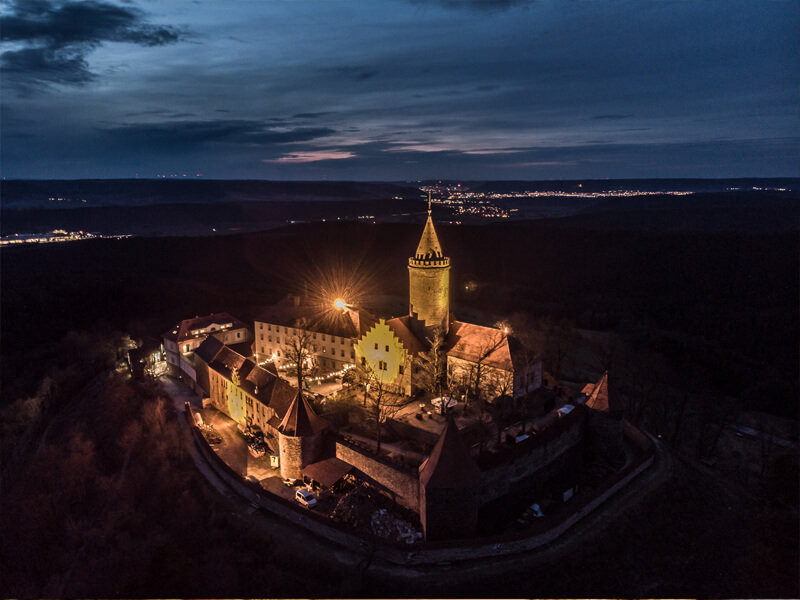 Auf der Burg angekommen, werden Sie mit einem herrlichen Ausblick belohnt. (Bitte planen Sie Ihre Anreise zu 18 Uhr auf unserem kostenfreien Parkplatz am Fuße der Burg und berücksichtigen Sie, dass der Aufstieg zur Burg ca. 15 Minuten Fußweg in Anspruch nimmt oder buchen Sie einen Shuttle über uns.)