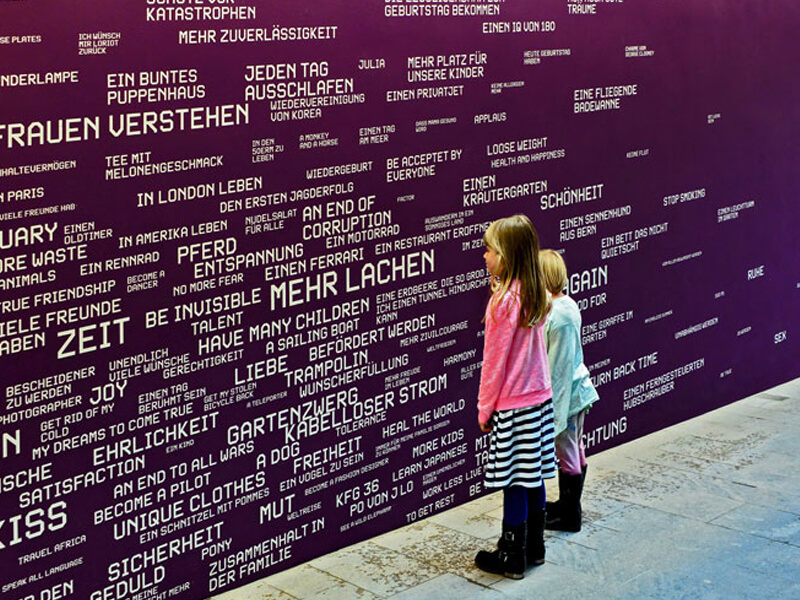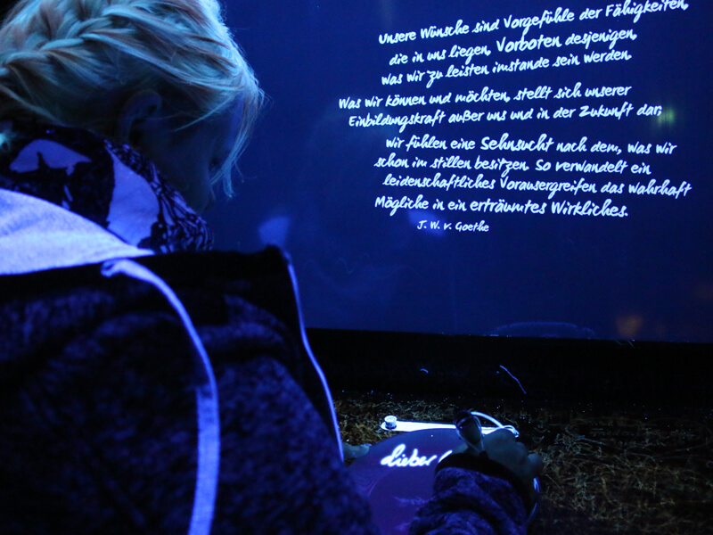 Wunder werden wahr: Der Besucher betritt einen schwarzen Raum. Sterne leuchten auf. Die Konturen des Raumes verschwinden, der Besucher scheint im Weltraum zu schweben. Nach und nach bilden sich Worte um ihn. Sie formen sich zu Wünschen. Plötzlich zerschlägt Porzellan und der Wunsch verschwindet.